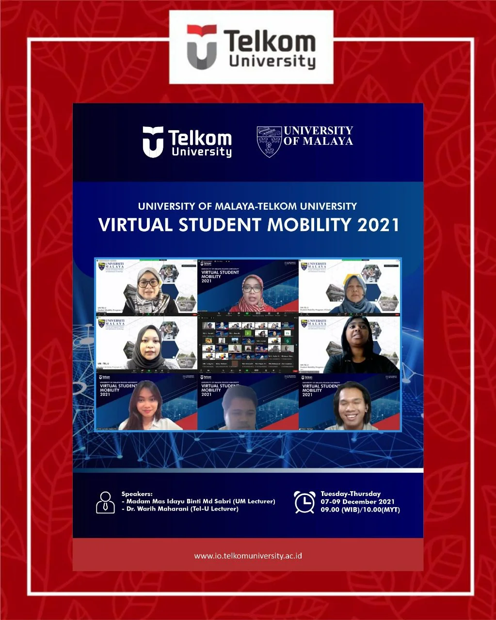 VSM Tel-U & Universiti Malaya. VSM (Virtual Student Mobility) is a collaborative program between Telkom University, Indonesia and Universiti Malaya, Malaysia to facilitate students in experiencing international mobility virtually. The VSM Tel-U & Univ. Malaya was attended by 57 participants from two universities. They join in this VSM program to enhance their knowledge, especially in the field of Game Programming and Social Media Analytics. As we know, in this digital era, many people spend their time with their gadgets by playing games and social media. VSM is certainly a great opportunity for game developers to create or develop games both offline and online games. Likewise with social media, to see the trends and the traffics of social media, social media analytics is needed. Thus, for example, business actors can market their products on frequently used social media.