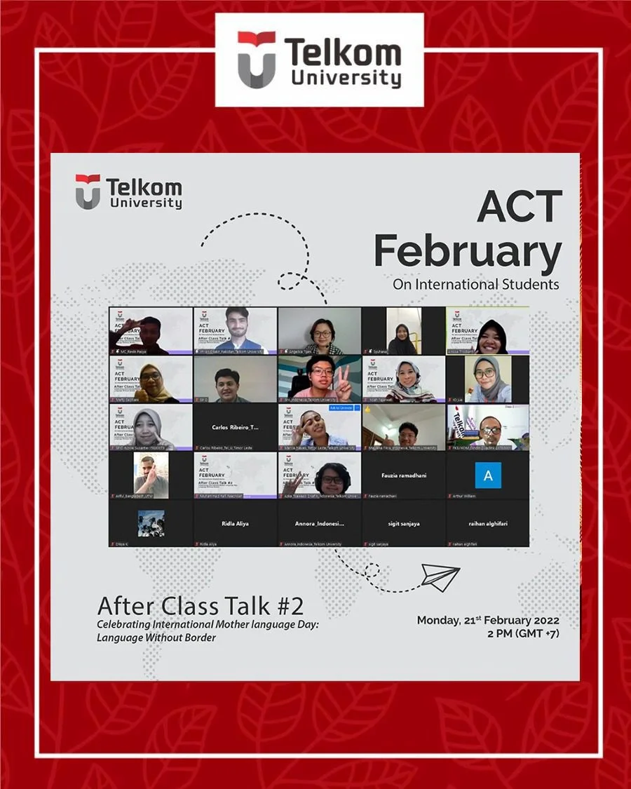 Responding to these commemorations, in 2022 Telkom University International Office is back with its splendid program After Class Talk. Entitled Celebrating Mother Language Day: Language Without Border, this event was held on Monday, January 21st 2022 at 2 pm via zoom meeting. The Celebrating Mother Language Day: Language Without Border event focuses on discussing the mother tongue of international students and how it influences their life. This Celebrating Mother Language Day: Language Without Border event invited Imran Ahmad Sakir (International Student Telkom University from Pakistan), Nur Syuhana (Universiti Utara Malaysia Student from Malaysia), and Angelica Tijan (Universiti Tun Hussein Onn Malaysia from Malaysia) to share their experience and opinion related to Celebrating Mother Language Day: Language Without Border.