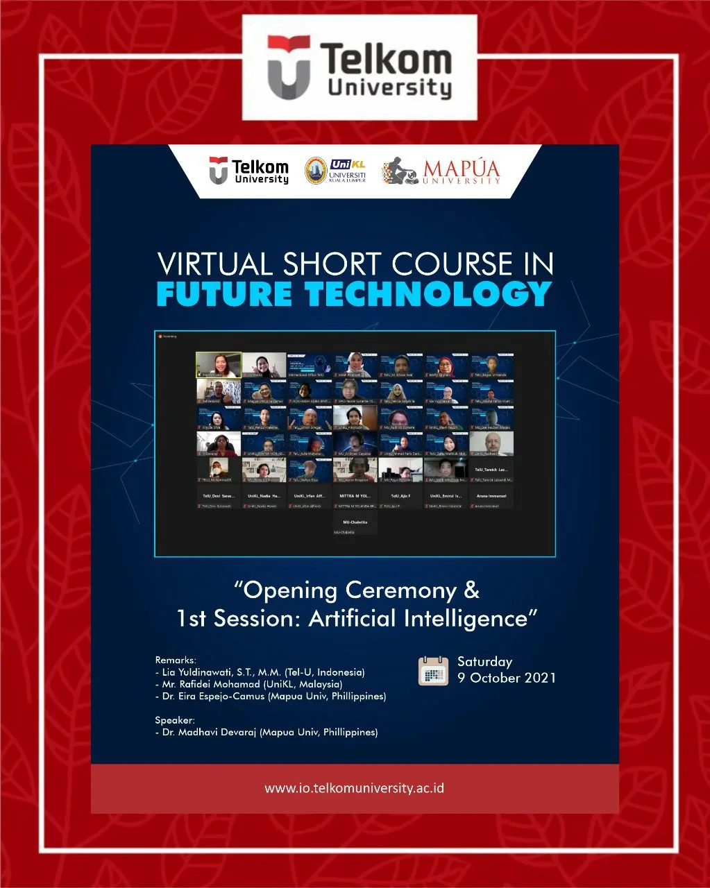 Future Technology Virtual Short Course is a student mobility program organized by Telkom University, Indonesia, Universiti Kuala Lumpur, Malaysia, and Mapua University, Philippines. This short course, that is scheduled from 9-30 October 2021, was designed to facilitate students to learn and explore the future technology that will be booming and profitable especially in digital era. The kick-off Virtual Short Course in Future Technology successfully held on Saturday, October 9th, 2021 by the remarks from representatives of three universities: