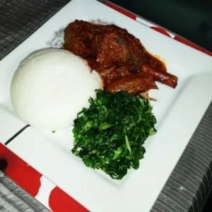 is made of Sadza, beef stew and vegetables with peanut butter.
