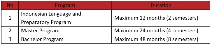 - Students of KNB Scholarship 2025 must study Indonesian language for foreigners or Bahasa Indonesia bagi Penutur Asing (BIPA) for 2 semesters/1 academic year before they start their academic study in their major.