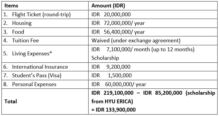 ESTIMATED BUDGET FOR THE PROGRAM OF SPRING SESP 2026 AT HANYANG UNIVERSITY ERICA