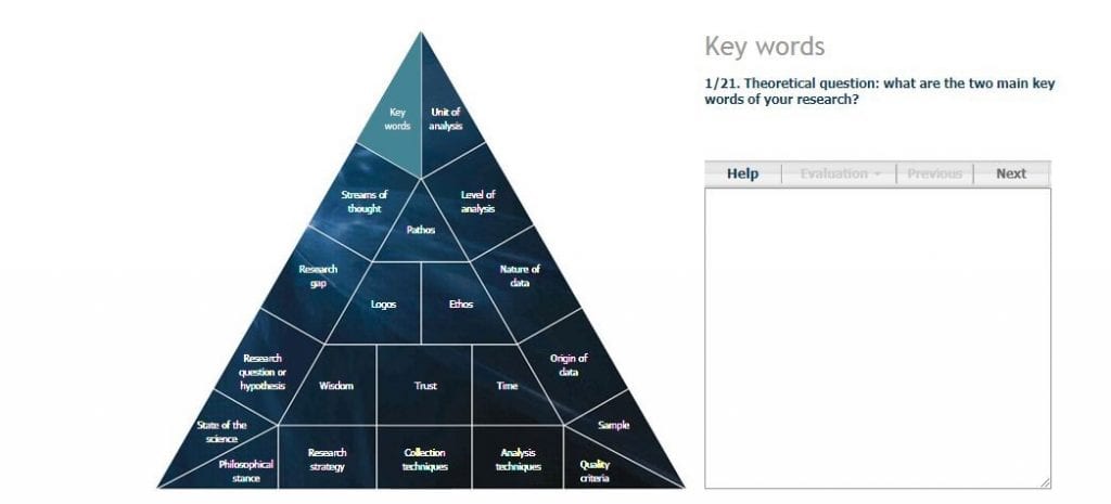 There are 21 puzzles in form of triangle that will help researchers (user) compose a research proposal. Every puzzle will guide user by providing question and small text-box to compose the idea. Beside, there are feature “help” for references that people might answer in each puzzle, and “evaluation” for measuring the idea whether it is 100% decided, 50% decided, or even 0% decided that will be highlighted by the color green, yellow, and red respectively. In the left side of the triangle, it consists of 5 puzzles about epistemological stuff; in the right side, there are 5 puzzles consisting of empirical/theoretical stuff; at the bottom side, there are 5 puzzles about methodological stuff; and in the middle, there are 6 puzzles consisting the information of the researcher and the research itself. The following is a picture of the 21 puzzles in Idea Puzzle Software: